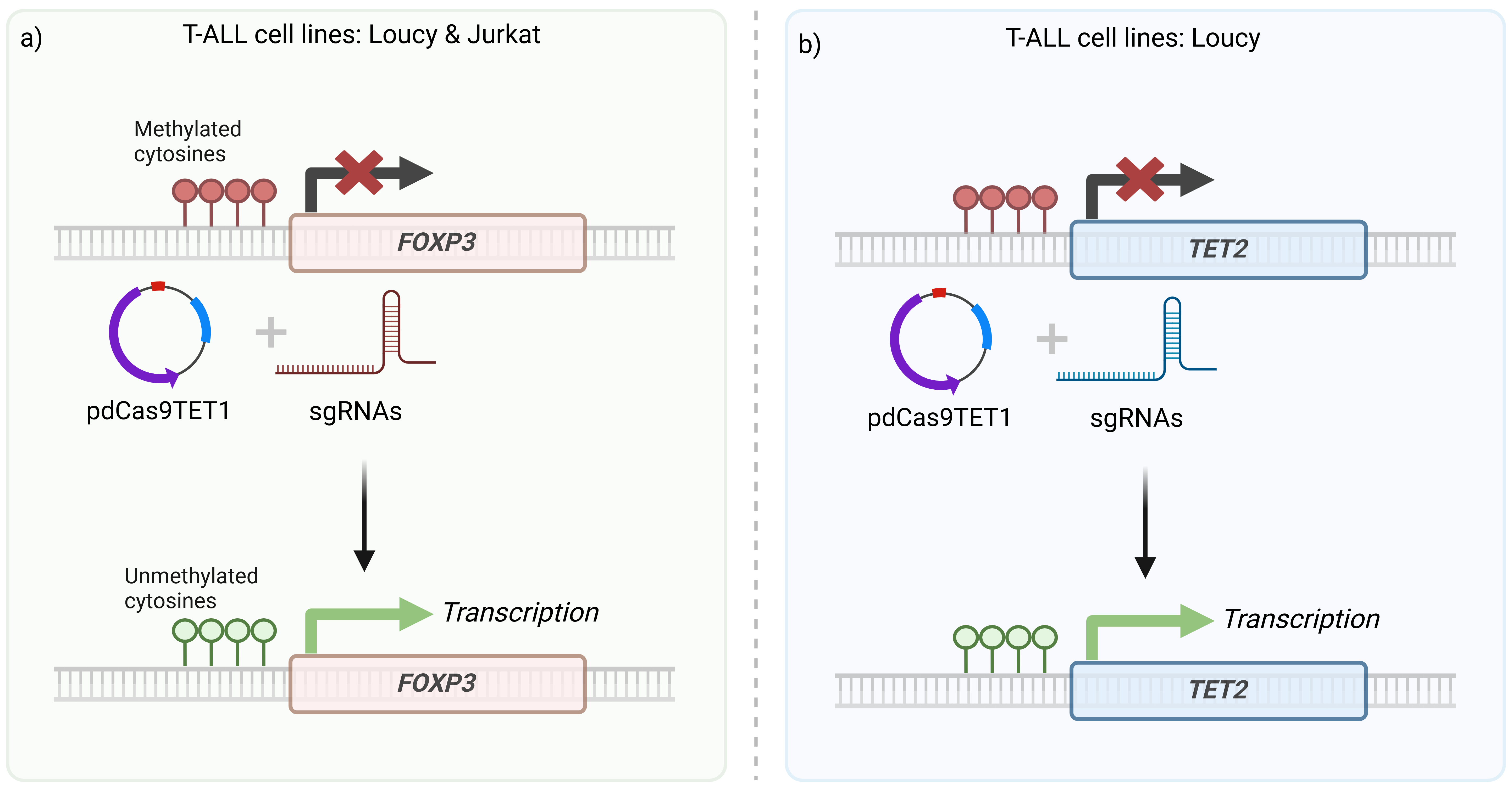 Research project investigating epigenetic reprogramming in T-ALL using CRISPR-dCas9-TET1 to reactivate the silenced TET2 tumor suppressor gene through targeted DNA demethylation.
